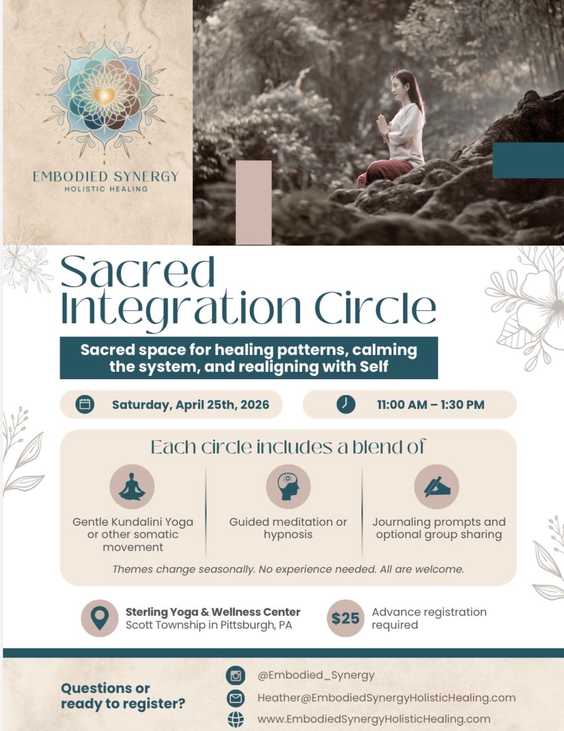 Registration fee: $25. To sign up, please email heather@embodiedsynergyholistichealing.com. After you reach out, you’ll receive a link to complete your registration and payment. (No walk-ins, please.)